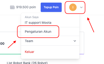 Klik Icon Profil di dashboard Moota kita, kemudian pilih "Pengaturan Akun"